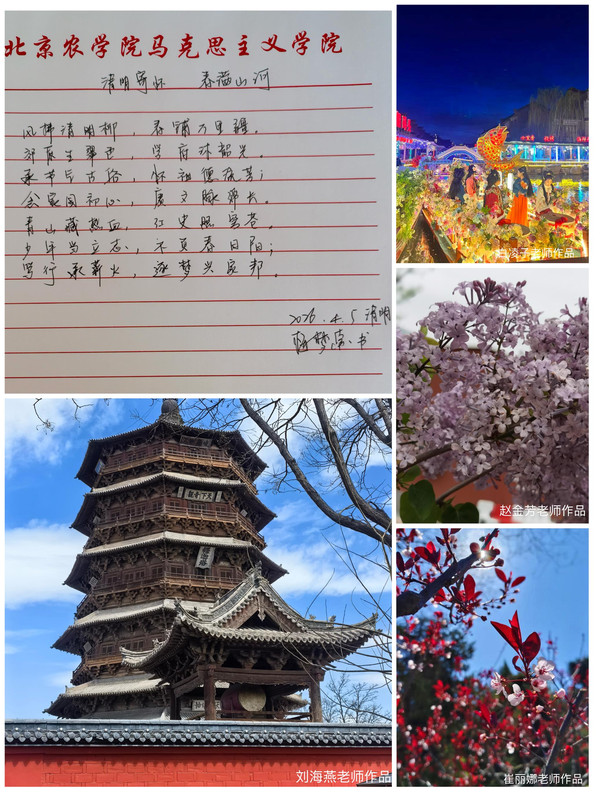 活动以清明节为契机,引导广大教职工亲近自然、感悟传统、传承文化,围绕清明民俗、春日风光等主题进行创作,深刻感悟其中蕴含的家国情怀、节气智慧与红色精神等思政元素,并通过艺术形式展现学院教职工积极向上的精神风貌与深厚的文化素养。